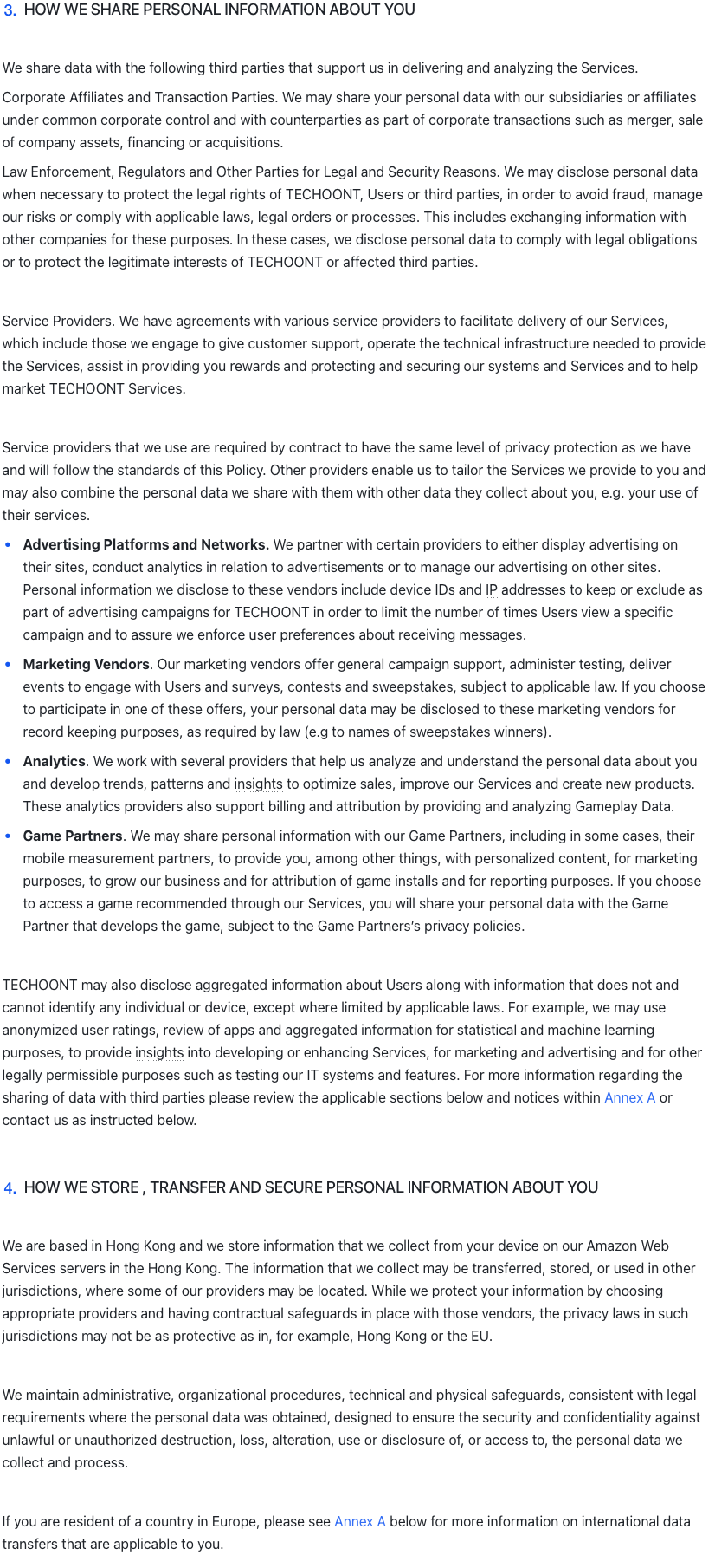 Please read the terms of this TECHOONT User Privacy Notice (this “Policy”) carefully. The Policy describes to users (“User,” or “Users,” or “you”) how TECHOONT LIMITED (“TECHOONT”, “we,” “us” or “our”) collects, uses, discloses or otherwise processes your personal data collected in connection with websites, mobile applications, progressive web applications, content, features, digital events or products we create or operate (the “Services”). This Policy is incorporated into and forms a part of TECHOONT’s Global Terms of Use (the “Terms”). As used below, capitalized terms not defined in this Policy have the meaning given to them in the Terms. “Personal data” and “personal information” generally mean any information that directly or indirectly identifies you, which might vary slightly depending on applicable laws. Examples of personal data include your name, phone number, email address, and other information about you such as data about your device or how you use the Services. This Policy does not govern your use of a third-party developer’s game that you discover and access through the Services. The processing of your data by the game developer (“Game Partners”) is governed by the game developer’s privacy policy which you should review prior to using their game and when exercising any rights subject to Game Partners privacy policy.