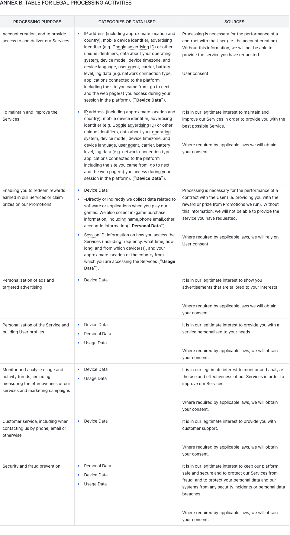 TECHOONT is the controller, within the meaning of applicable laws, with regard to the collection, processing and use of personal data in the context of the Services and as described in this Policy. This means TECHOONT is responsible for deciding the purpose and the means of how your personal information will be used and processed. We collect information that you direct us to collect, such as your email,phone or other accountId when you when you claim your reward; indirectly, such as your IP address when you download our app; and from other sources, such as public record sources; or information from our partners or clients, depending on our relationship with them for the purposes listed in this Policy and in accordance with applicable laws. We have specified the personal data we collect in Annex B, Table for Legal Processing Activities, in this Policy.